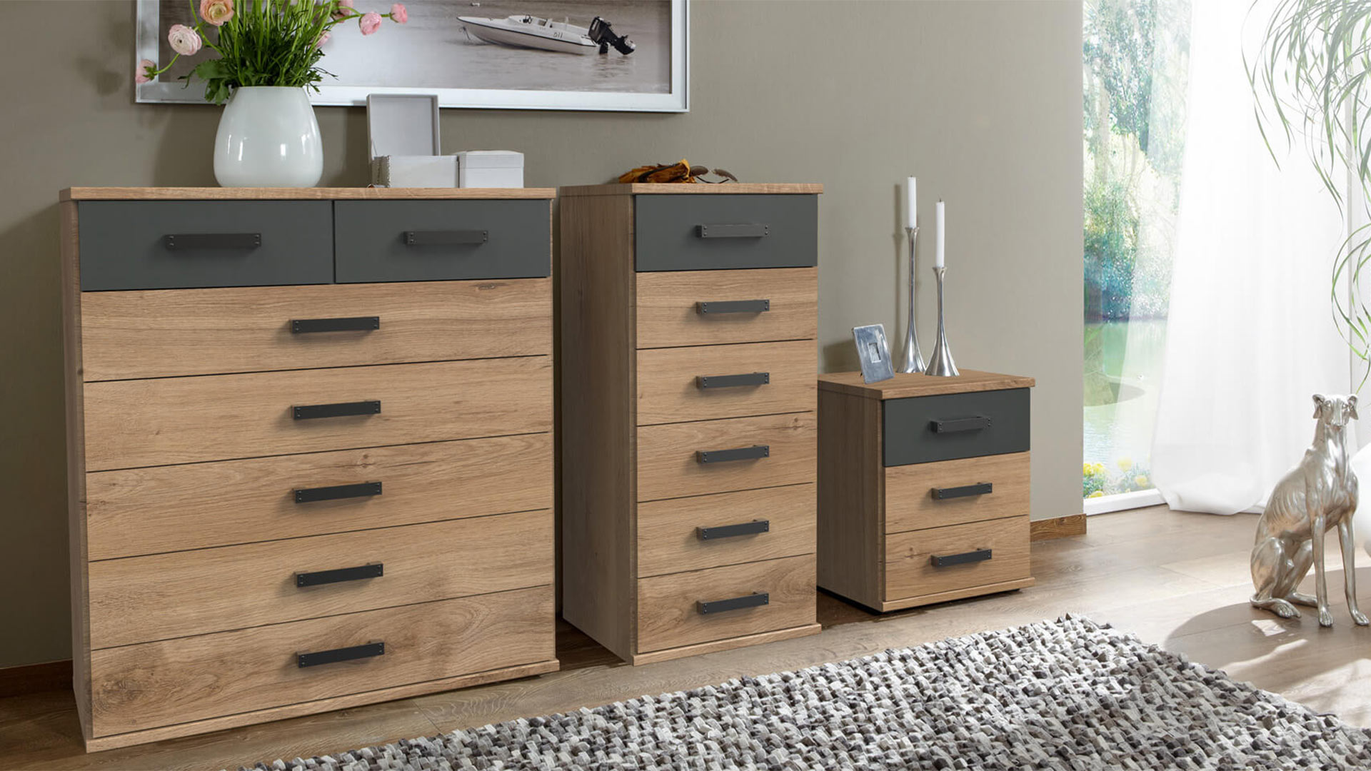 Industrial chic meets a natural look: If you like your interior design to be both rustic and urban, then the CORK hinge-door wardrobe range is the perfect choice. The graphite-coloured door fittings, cabinet handles and trims are reminiscent of solid metal and, in combination with the fronts made of plank oak repilca, give your CORK revolving door cabinet the ultimate kick. The sturdy wardrobes with the practical revolving doors are available in two different widths, including drawers and provided with one or two mirrors.